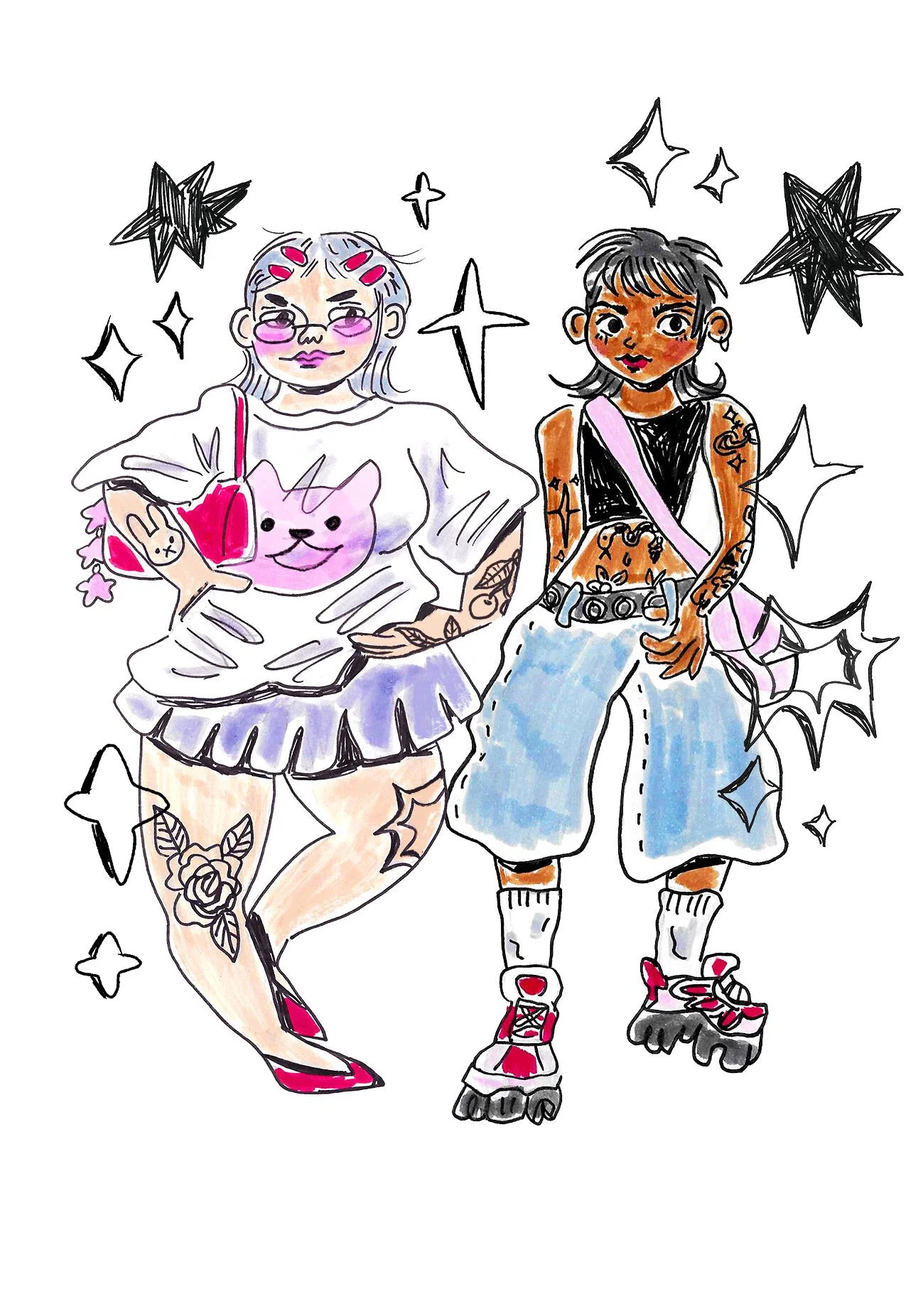 Big top little pants, little top big pants. Personal illustration as a fun ode to summer dressing. Done with ink and brush pens.